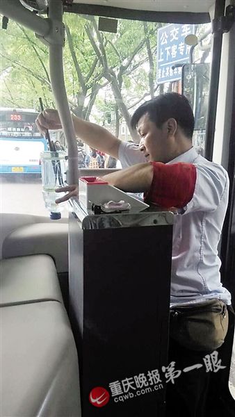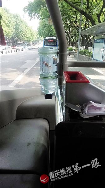 重慶晚報(bào)記者從前門上車,一眼就看見門柱上綁一個(gè)小號飲料瓶,票箱旁綁著一個(gè)大號飲料瓶,瓶子被白色扎帶和膠皮管牢牢系住,瓶口向下,瓶子底部被剪開朝上。大號瓶里有兩條小金魚,正歡快地游著。