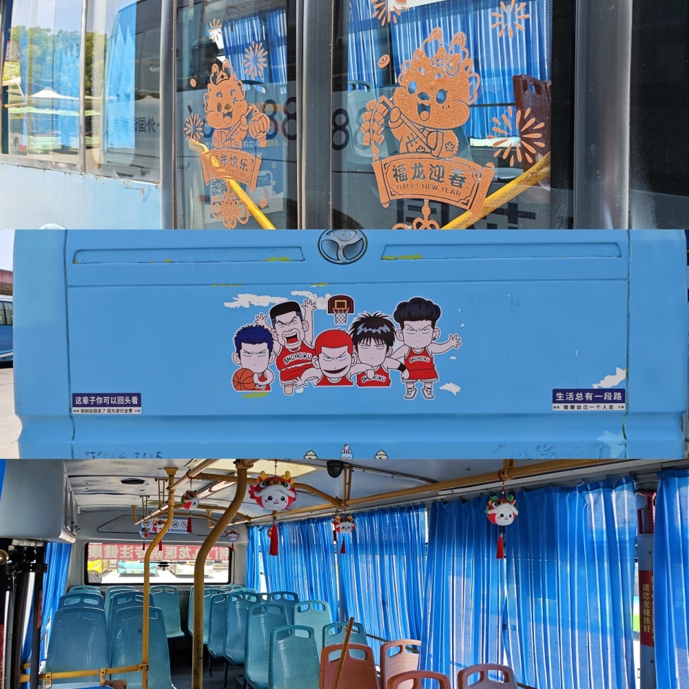 2020#車還有另外幾處細(xì)節(jié),引起小編注意,上下車門處貼有卡通人物和“福龍迎春”貼紙,車尾部貼有“灌籃高手”人物貼紙和提示標(biāo)語(yǔ),車廂內(nèi)的扶手桿則掛滿了喜慶娃娃??吹竭@些裝飾和布置,仿佛感受到了駕駛員的熱情、認(rèn)真和細(xì)膩。