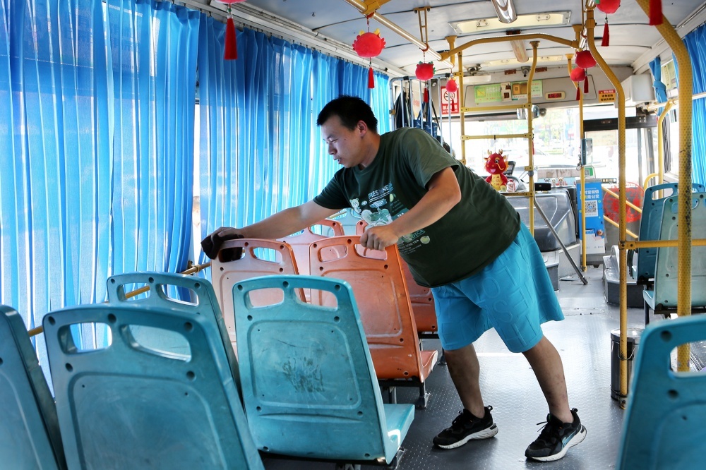2020#車是揚(yáng)子江早年出廠的一輛“老爺車”,今年即將達(dá)到報(bào)廢年限,但走進(jìn)車廂內(nèi),地板明亮反光,車窗清晰透亮,窗簾座椅清爽整潔,更像是一輛嶄新的“空調(diào)車”,問(wèn)起如何將車輛打掃得如此干凈,張峻峰講出了他的工作心得。