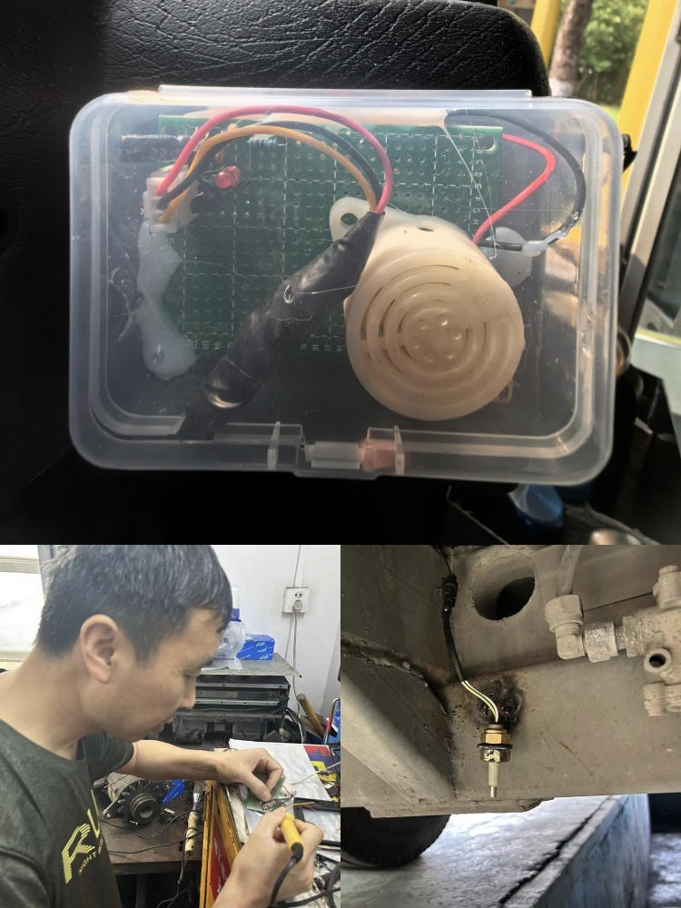 “涉水預(yù)警”裝置工作原理:涉水裝置由普通元器件及蜂鳴器焊接而成,在涉水路面通過傳感器泡水觸發(fā)蜂鳴器報警,進而提醒駕駛員。