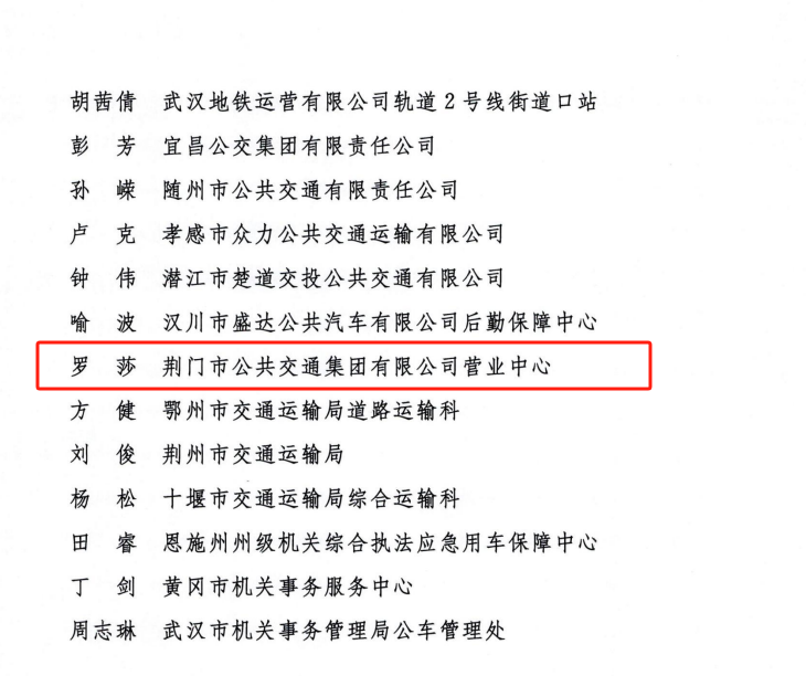 近日,交通運(yùn)輸部、公安部、國家機(jī)關(guān)事務(wù)管理局、中華全國總工會(huì)、共青團(tuán)中央聯(lián)合發(fā)出《關(guān)于表揚(yáng)2023年綠色出行宣傳月和公交出行宣傳周活動(dòng)成績突出集體和個(gè)人的通報(bào)》。其中,荊門市公共交通集團(tuán)有限公司營業(yè)中心被評(píng)為活動(dòng)成績突出集體,荊門市公共交通集團(tuán)有限公司羅莎被評(píng)為活動(dòng)成績突出個(gè)人。