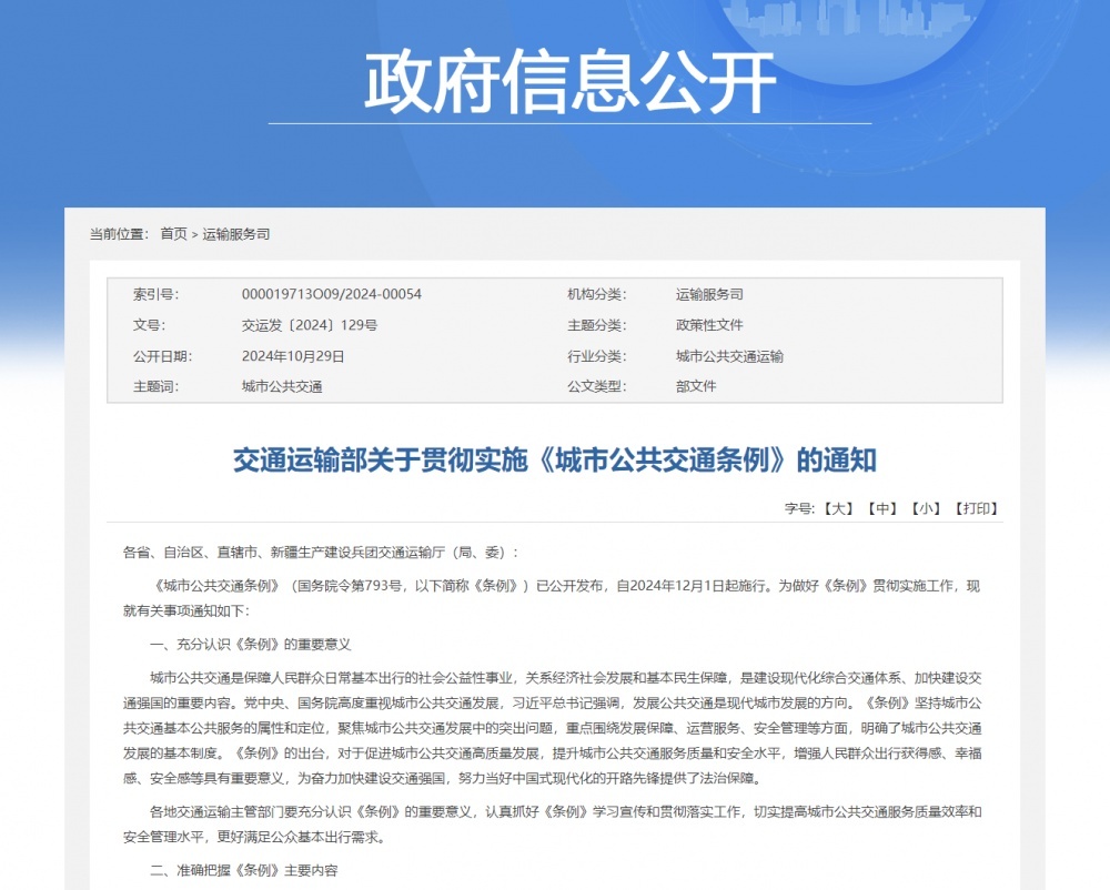 10月29日,交通運輸部網(wǎng)站發(fā)布《關(guān)于貫徹實施〈城市公共交通條例〉的通知》。通知提到,從充分認識《條例》的重要意義、準確把握《條例》主要內(nèi)容、有力保障《條例》落地實施來貫徹實施。