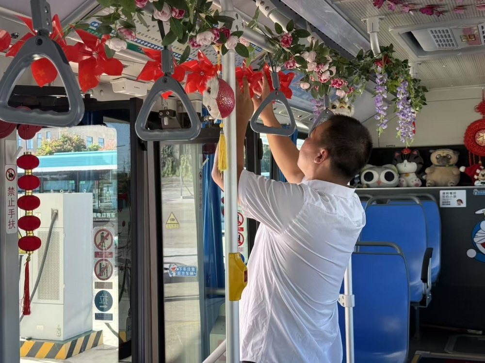 張峻峰是荊門公交2024年度“最美公交人”,他的車上總比別人多點“暖心”東西:駕駛座旁的小盒子里備著暈車藥、創(chuàng)可貼和折疊傘。“今年國慶,就想乘客上車能樂呵樂呵?!庇谑菑埦寰蛣恿搜b飾車廂的念頭。他自費買了小國旗、風(fēng)車、燈籠等裝飾,晚上在家剪剪貼貼,白天利用休息時間在車上裝飾。張峻峰的行動,也是荊門公交服務(wù)提升的一個縮影。