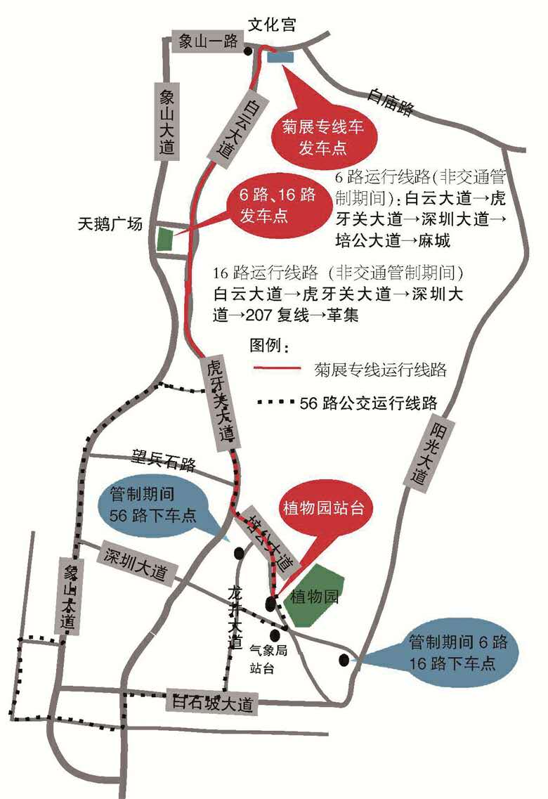 值得說(shuō)明的是,菊展期間,公交按現(xiàn)行票價(jià)收費(fèi)。菊展前三天,深圳大道東端、培公大道(培公大道與龍井大道交叉路口至培公大道與白石坡大道交叉路口)將實(shí)現(xiàn)交通管制,禁止公交車通行,這樣一來(lái),上述四條公交在植物園附近的線路和停靠站點(diǎn)將同步調(diào)整,菊展專線公交車將??吭谂喙蟮乐参飯@出口,其他時(shí)間??吭谥参飯@大門(mén)附近的植物園站臺(tái)。交通管制期間,16路公交車、6路公交車將??吭诎资麓蟮罇|上下車。56路交通管制期間線路不延伸,在培公大道與龍井大道交叉路口上龍井大道,游客可在龍井大道北段上下。荊門(mén)晚報(bào)訊(記者戴永君)