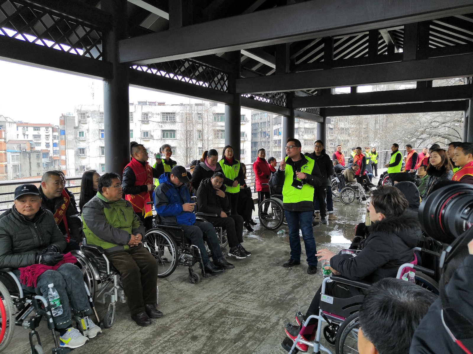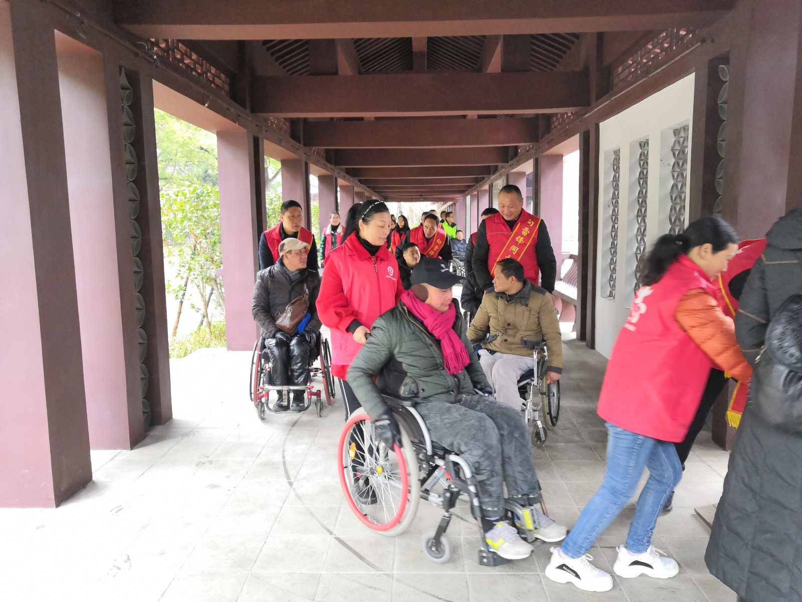 龍泉公園長(zhǎng)廊,在公園導(dǎo)游的介紹下,殘疾朋友及隨行的志愿者們更清楚的知道了龍泉公園的建園歷史和荊門故事。
