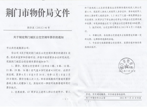 根據(jù)荊門市物價局《關(guān)于制定荊門城區(qū)公交空調(diào)車票價的通知》(荊價發(fā)[2013]46號)及《關(guān)于制定荊門城區(qū)2路等11條線路新增公交空調(diào)車票價的通知》(荊價發(fā)[2013]48號),公交空調(diào)車2014年6月1日至9月30日營運(yùn)時段內(nèi)執(zhí)行2元/人次票價,現(xiàn)就執(zhí)行公交空調(diào)車票價后的有關(guān)事項(xiàng)公告如下: