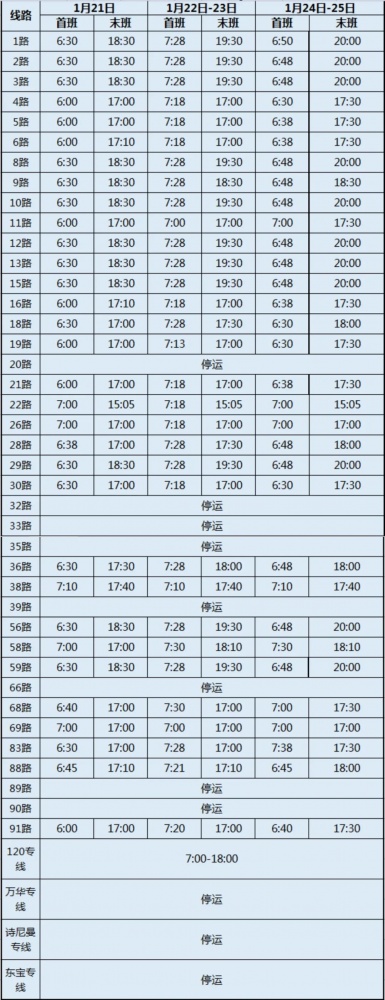 春節(jié)期間,市公交集團公交線路營運計劃有調整。2023年1月21日-1月25日(除夕至初四)各營運線路相較平常在首末班次、發(fā)班間隔上有所變化,為方便廣大市民春節(jié)前后出行,現(xiàn)將春節(jié)期間公交營運安排通告如下: